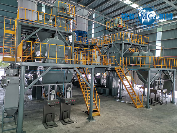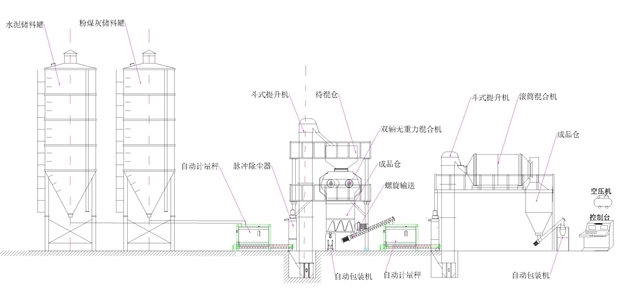 該套生產線在全自動干粉砂漿生產線的基礎上,增配針對玻化微珠物理特性專門研制的離心式滾筒混合機及高效專用體積打包機(敞口包裝機可選)。該套生產線效率高、產量大、適用性強、操作性好。該套設備實現多點除塵處理,工作環境好,有力保障員工身心健康,創造高效清潔的生產環境。