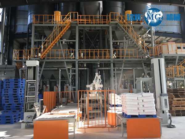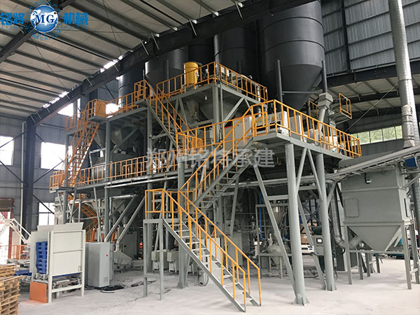 該生產(chǎn)線可在傳統(tǒng)常規(guī)配置的基礎(chǔ)上增加添加劑自動(dòng)配料系統(tǒng),玻珠及添加劑氣力輸送系統(tǒng),以及成品砂漿自動(dòng)包裝輸送碼垛系統(tǒng)。